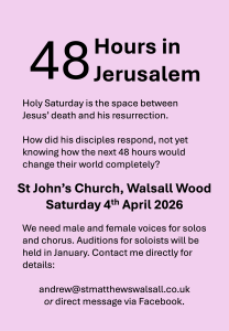 If you’d like to sing in the chorus or audition for a lead role, please do get in touch – andrew@stmatthewswalsall.co.uk – and we can talk. And on the day, it’ll be free to attend and everybody will be welcome.